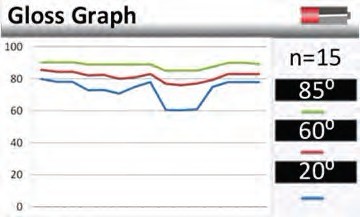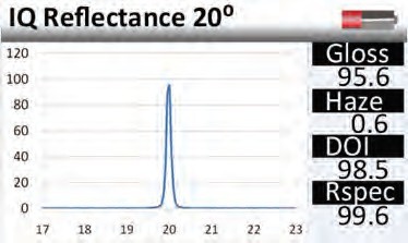 鏡向光澤度-該儀器顯示的是表面17-23°的反射面。圖中曲線的形狀描述了光和表面的相互影響。接近鏡面的曲線的急轉(zhuǎn)彎說明了表面光滑的高反射。
